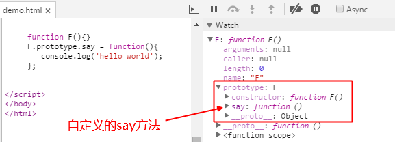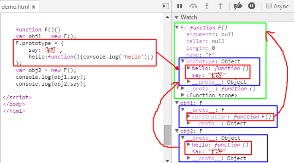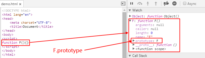 prototype就是通过调用构造函数( F )创建出来的那个对象( f1 和 f2 )的原型对象