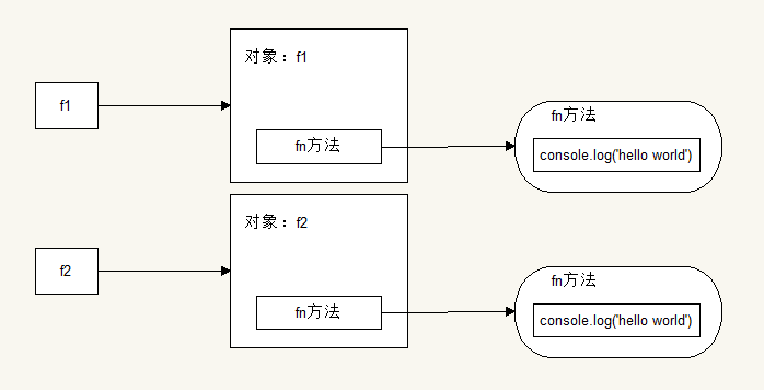 console.log(f1.fn === f2.fn); // => false通过比较两个实例对象的 fn 方法可以得出:每个实例对象的 fn 方法是独立存在的